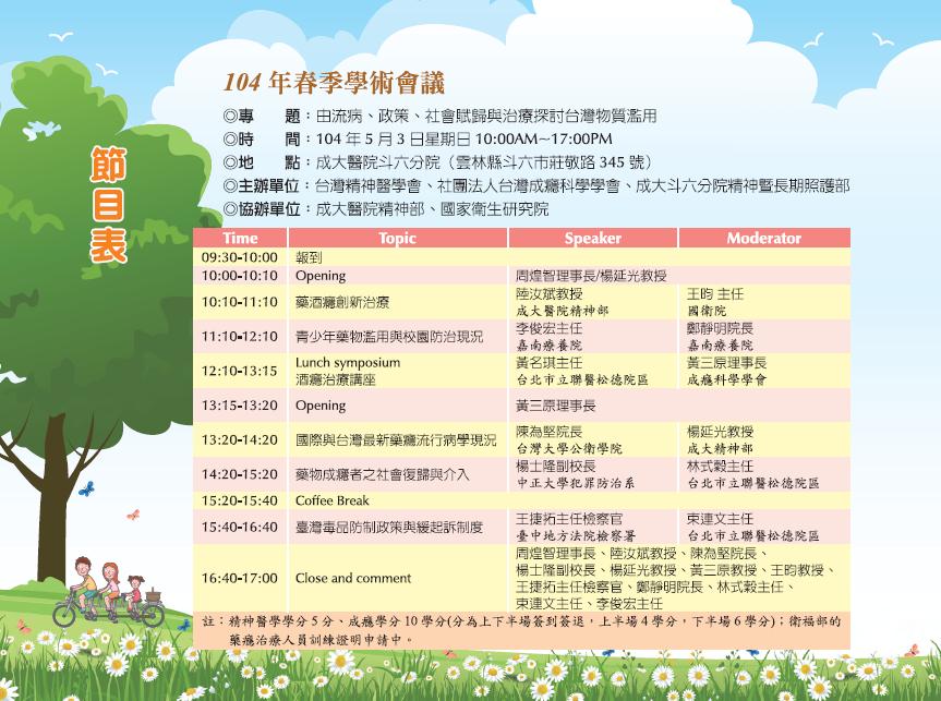 📢國衛院與台灣精神醫學會、台灣成癮科學學會及成大醫院精神部合辦-104年度春季學術研討會