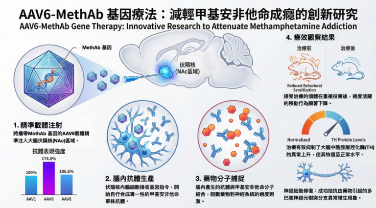 國家衛生研究院神經與精神醫學研究中心(簡稱神醫中心)的劉誠珍副研究員與陳雲翔合聘副研究員研究團隊,近期在 Addiction Biology 發表一個相當創新的研究:利用基因療法讓小鼠體內自行產生能夠「捕捉」甲基安非他命的抗體,從而降低毒品對小鼠大腦的影響。這項研究顯示,透過基因工程技術在大腦中表達特定的抗體,可能有機會減弱與成癮相關的神經與行為變化。